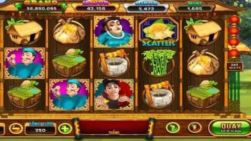 - Giao diện mượt, hình ảnh dân gian: Thiết kế gần gũi với quạt mo, nón lá, trâu vàng, tạo cảm giác giải trí thoải mái khi quay.